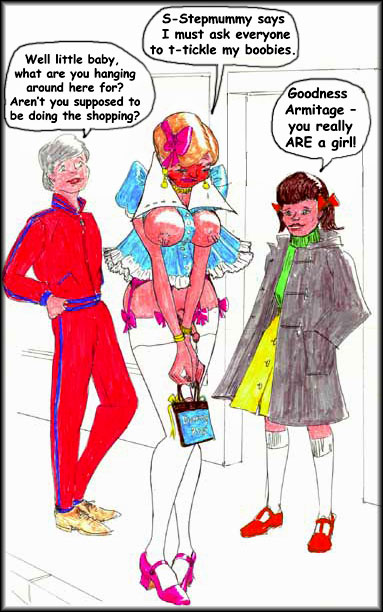 "Oh my GOD, Jase, it's Phillip fuckin Armitage!" Allison stood still for a full ten seconds, mouth agape, taking in the spreading mini skirt of this guy's dress with its spreading white collar and white frill round the bottom. And on the front of it - a couple of falsies like tgs wear.