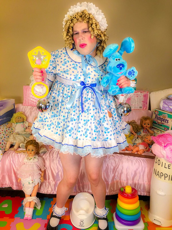 Speaking of throbbing penises, I'm afraid that I now admittedly feel quite subservient to them. In fact, one of my fantasies involves being under the care of a stern maternal guardian who not only keeps me in a constant state of babification, but also ensures that I regularly interact with other male genitals for her own entertainment. One such amusement involves her (as well as several of her lady friends) watching me undergo "lollipop therapy" with all the well-endowed male visitors she frequently invites over for me to "service". While Prim no doubt could more eloquently describe what happens next, suffice it to say after hours of squelching and slurping, I'd find myself left in a crumpled mess on the floor, with semen plastered all over my plastic baby bib and makeup-streaked face. I would then be fastened into my nursery crib overnight like this, crying myself to sleep while my own flaccid 'sissy nipple' oozes harmlessly into the safe confines of my poofy double-thick diapers and plastic panties.