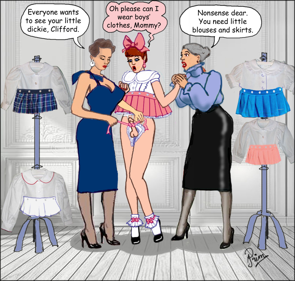 I wonder if you know that in the first place, Miss Popsey was not a Prim idea: she was thought of by Penelope-Pin-Prick, who wrote a lot of stories and drew pics for Prissy years ago. Prim has borrowed that wonderful character, and she still dresses sissies in some of his stories now, for example in the Felicity Room or the Jennifer Jayne Room. I agree with you: she has no mercy on these dribbling sissies who are brought to her to be dressed.
