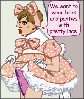 "Stand in line as you should, sissies," I insisted, sitting watching them, fully aware that the first sissy would now be having his fourth wank of the day since he had had an early double wank-off before the mid-morning cumming. "Now, remind yourselves how sweetly you are dressed for your girly sexual spending as sissy-girls by Nurse Tightskirt. Prepare yourselves first of all by checking and adjusting your dress. Brandie, you look like you are truly a girl in your lovely peach pink spotted dress. Lovely, sissy-girl. Now your make-up mirrors, all three of you. Are your eyes looking sweetly girly? And your lips, do they need more shaping. If you are happy that you are deeply feminine and pretty you may put away your purses. Check your lingerie, your suspenders, your stocking-tops. Now, fluff out your petticoats and dresses. Good girl, Plaid, frill out the back of your lovely pink dress, now the left side, now the right side, and now the front over your pretty petticoats for me. How darling you look, Sweetie, you must be feeling so like a girl in your heart. So pretty and so feminine. Is your feminine little dickie feeling ready to be wanked by Nurse Tightskirt in a few moments, darling?"