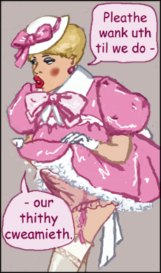 Plaid Cupcake shrank into a sissy stoop beneath his little white girls' panama hat. "Yeth Nurthe, I feel tho pwetty, an' yeth I'm a luvverly lickel girlie, all weady for my thithy wanky-wankieth." His cock was already quite upright under his petticoats: I could see its shape in the skirt of his rose pink dress.