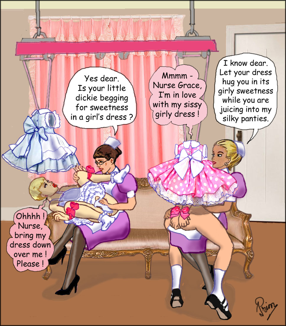 "Come and sit on our knees," said Nurse Grace. "To start your girlish appreciation of your dresses for today, you will spend a part of each hour submerged beneath your dress, breathing its feminine sweetness and taking in its soft embrace.