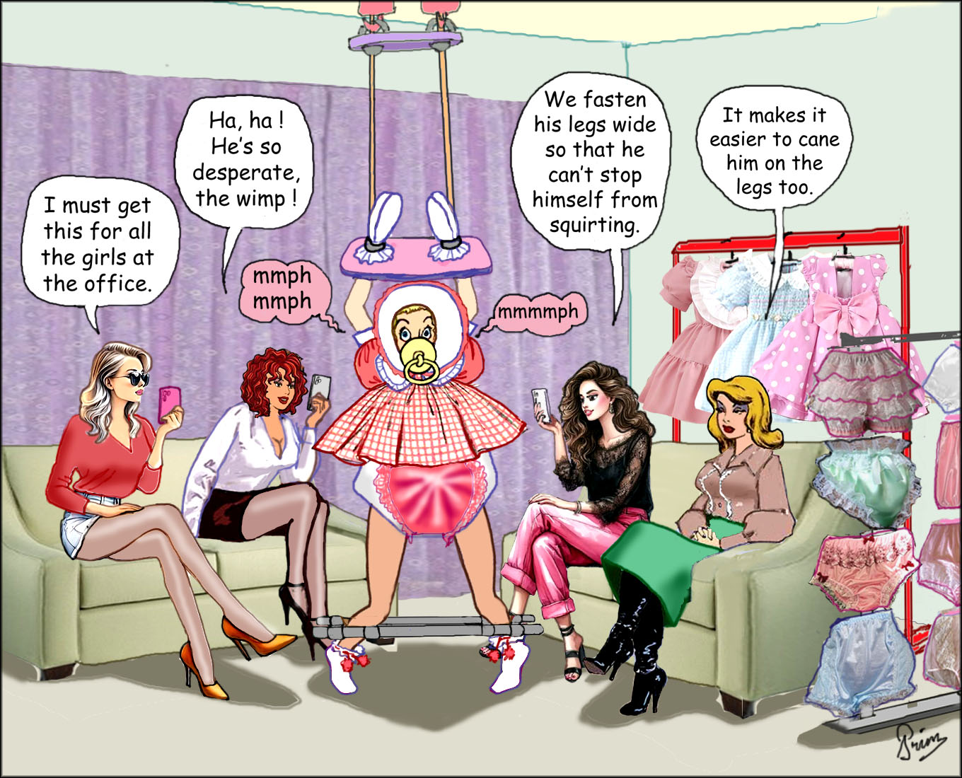 Tamara's mother Francesca answered the doorbell to let the girls in. They both wanted to show the pathetic fool to their friends, starting today with Tamara's former college friends Debbie and Nikita. "Tamara's just putting him in his diaper," Francesca explained as she led them into the sitting room. "We're going to hang him up in his display dangler to watch him wriggling and squirming like the baby he is."