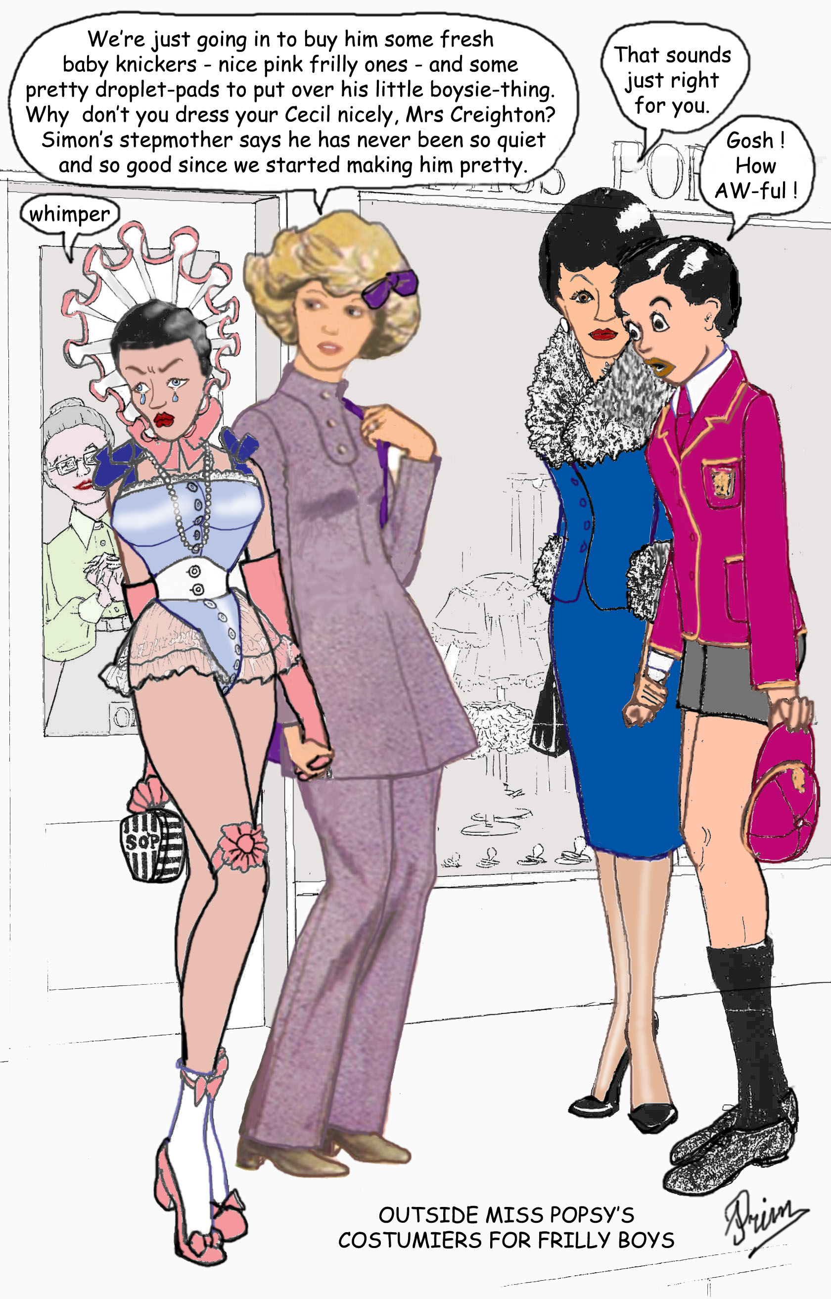 Sissies of all ages will always dread finding themselves inside the dainty, perfumed shop interior of Miss Popsy's Petticoat Shop. They are there for one reason only: to be stripped to the bare skin so that Miss Edna Popsy can work her pitiless torment on them by choosing the youngest and the prettiest dresses to put them into so as to thoroughly emasculate the youth and drain him of his manhood.